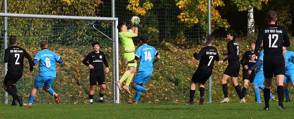 Nun kam die beste Zeit der Gastgeber. Nach einer Flanke verpassten sie den Abschluss. Die dickste Möglichkeit ihres Spiels hatten sie nach einem Freistoß, der Kopfball landete zum Glück in den Händen des SSV-Schlussmanns. Allerdings hatte auch die Abseitsfahne des Linienrichters in der Luft gestanden. Sie witterten nun Morgenluft und als erneut Pfiffe nicht so ausgelegt wurden wie sie es gerne gehabt hätten, spielten sie sehr hart weiter. So hatte SGD-Akteur (Nr. 6) in der 35. Minute Riesenglück nach einer Frustattacke nicht vom Platz gestellt zu werden. Sayda antworte nun mit der richtigen „Sprache“. Eine Ecke von G. Kowalkowski beförderte Julius Richter zum 2:0 in die Maschen.